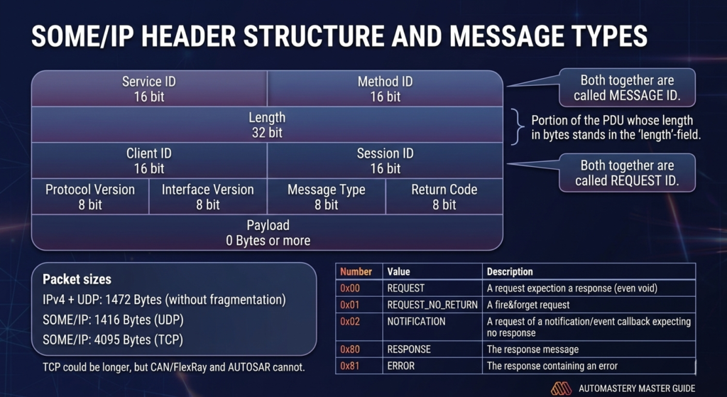 To make these services talk to each other, we use SOME/IP (Scalable service-Oriented MiddlewarE over IP). Every packet sent has a specific “ID Badge” called the SOME/IP Header.